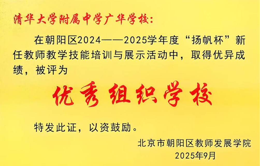近日,2025年朝阳区“扬帆杯”新任教师教育技能培训展示活动圆满落幕。清华大学附属中学广华学校凭借系统的校本研修体系、扎实的备赛组织与突出的教师表现,荣获“优秀组织奖”,充分展现了学校在新教师培养方面的阶段性成果与机制活力。